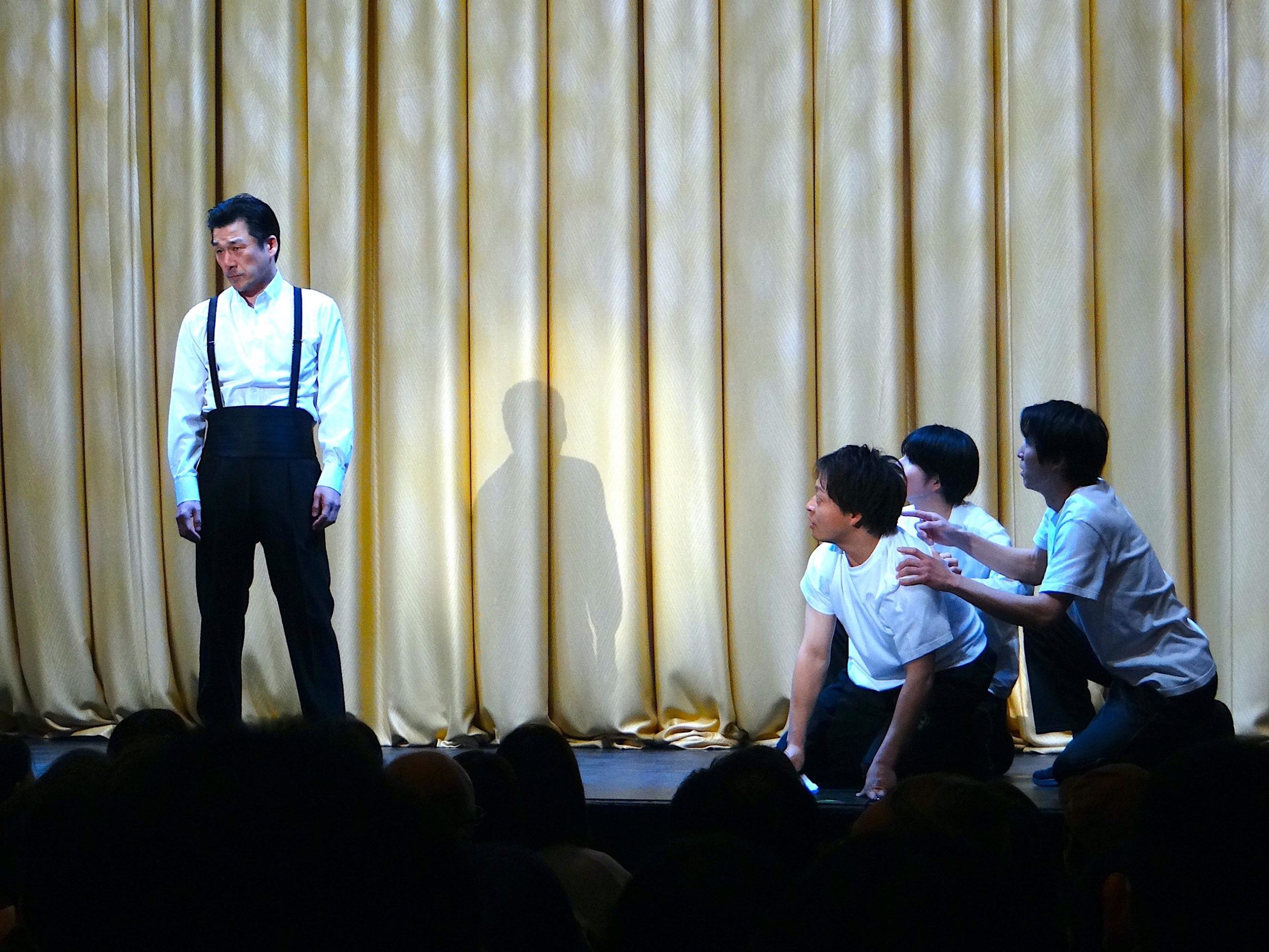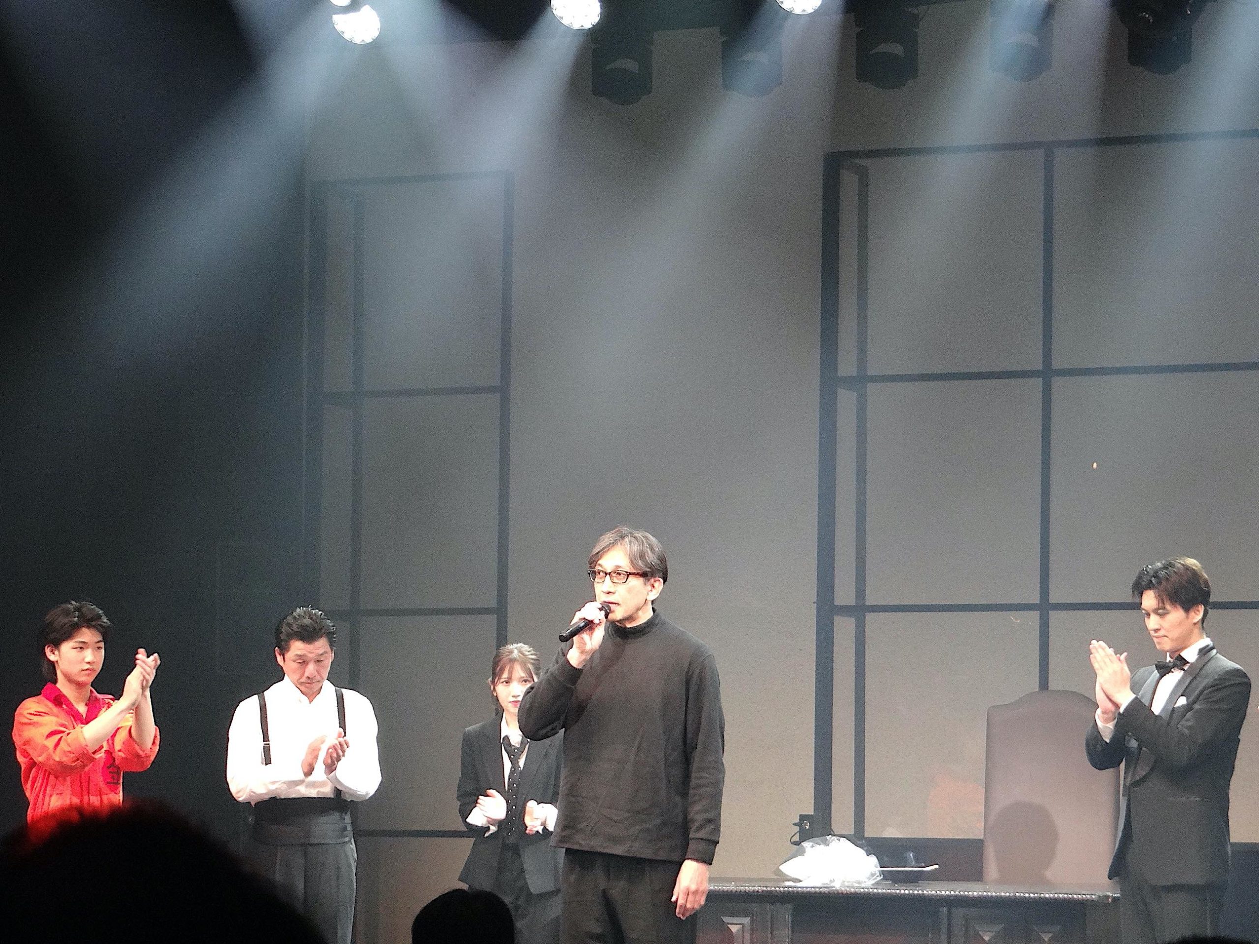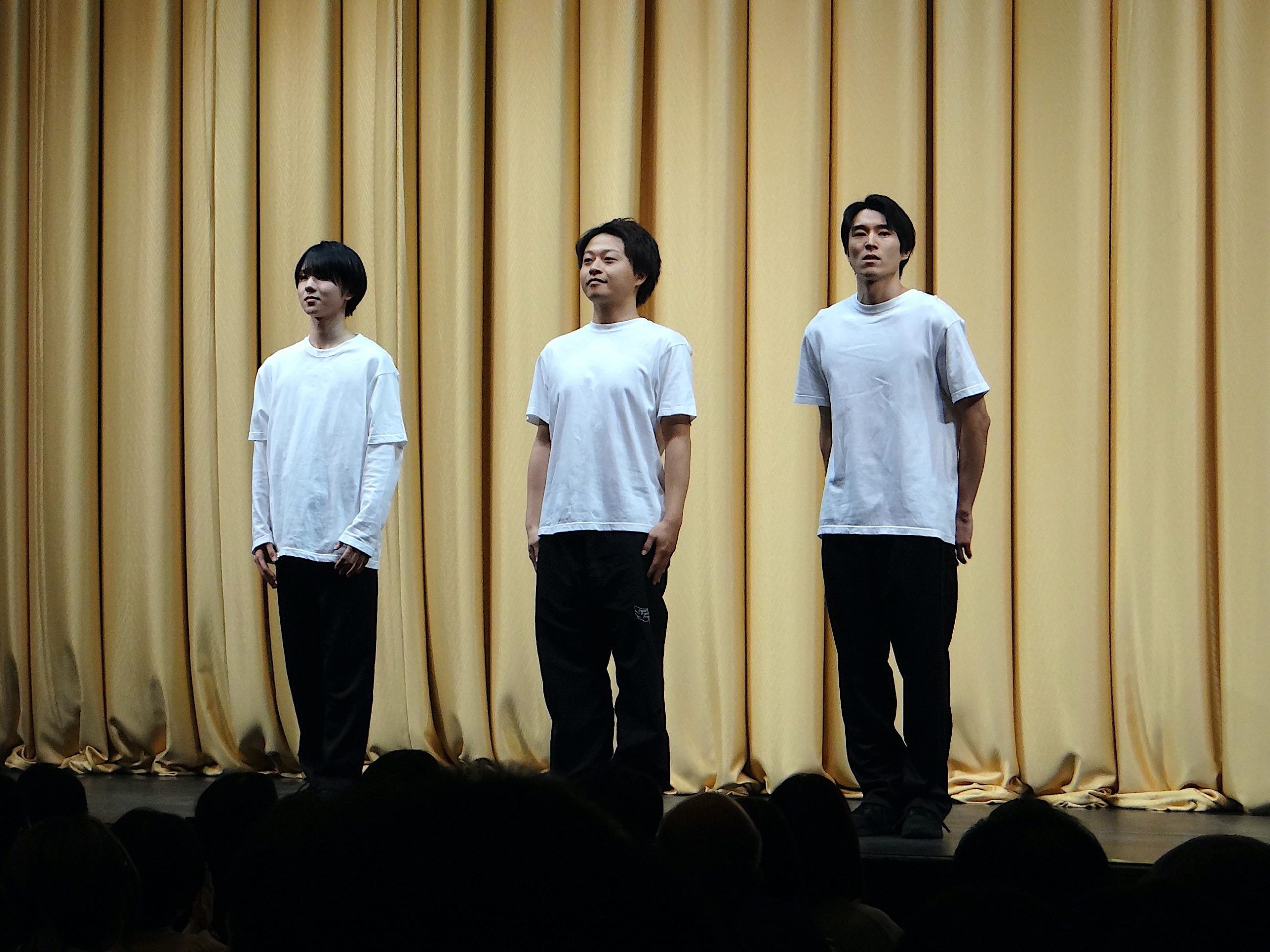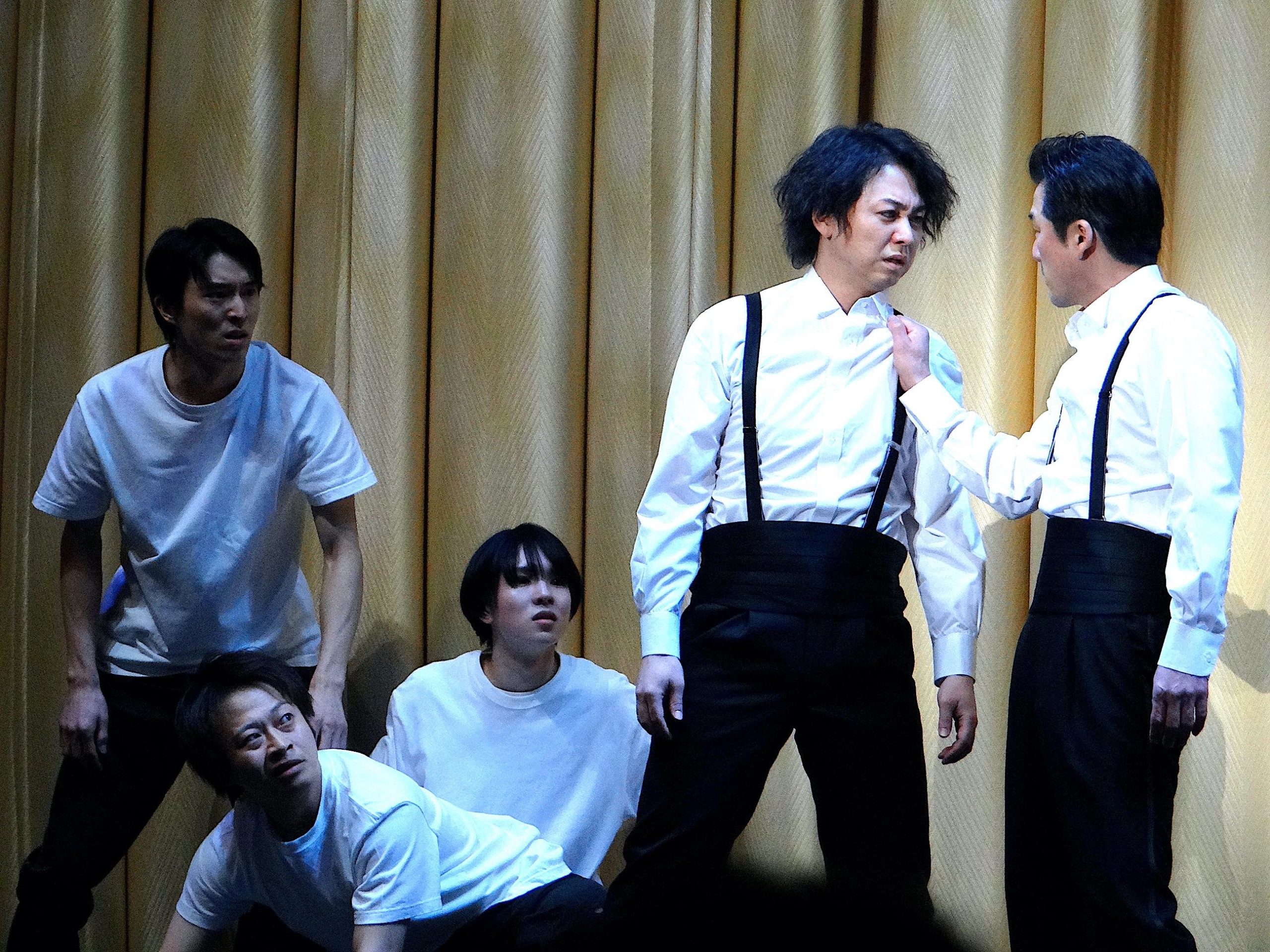 緞帳が下がったままの舞台上に登場したのは、河本佑貴、木村来士、濱田和馬。今日この日を迎えた謝辞とともに、おもむろに河本が、つかこうへい氏に宛てた「人は幸せになるために生まれてきた」という言葉を噛み締めた手紙を朗々と読み上げるーーと、特別ゲストの北区つかこうへい劇団2期生、吉田智則が登場。