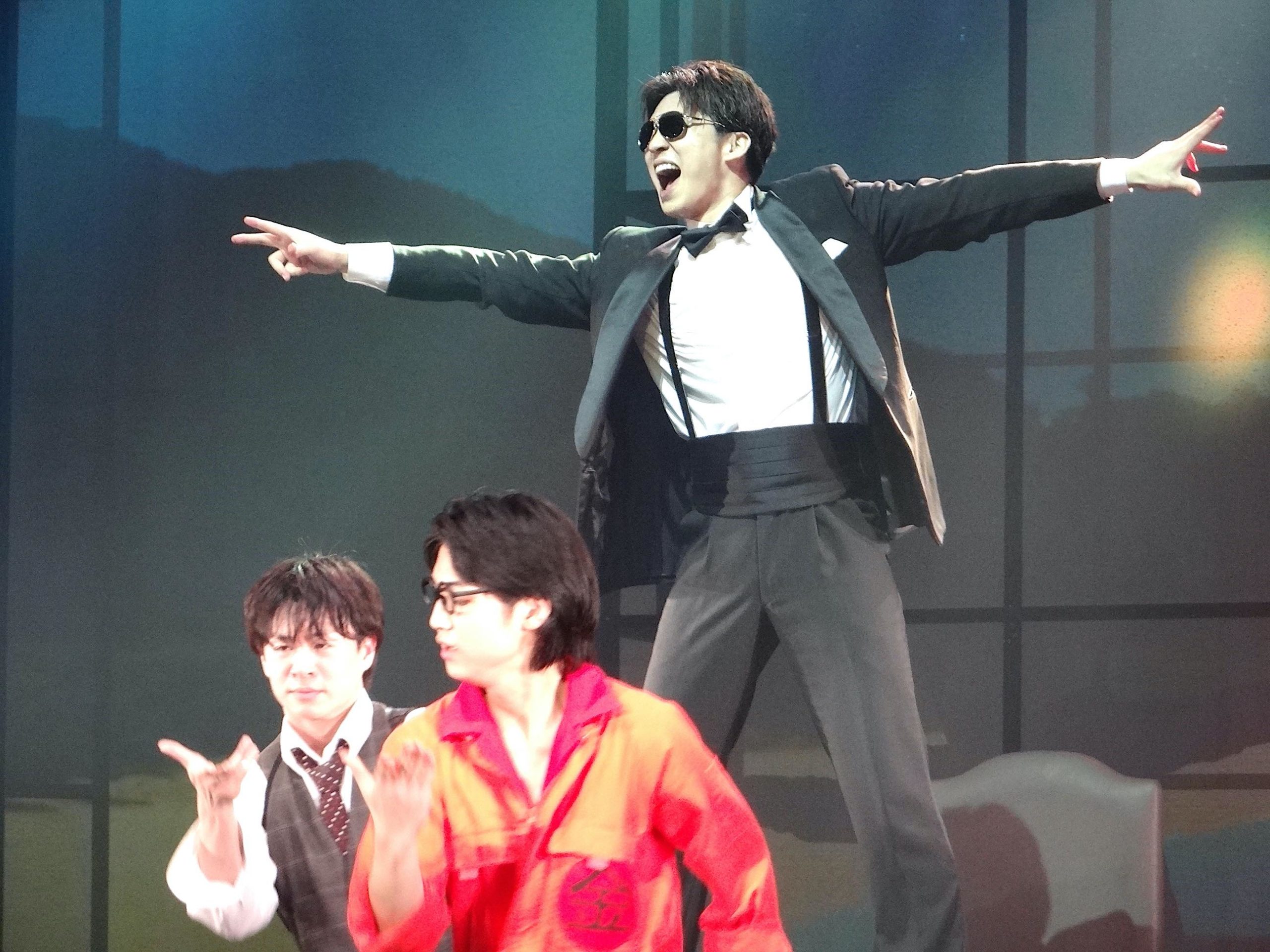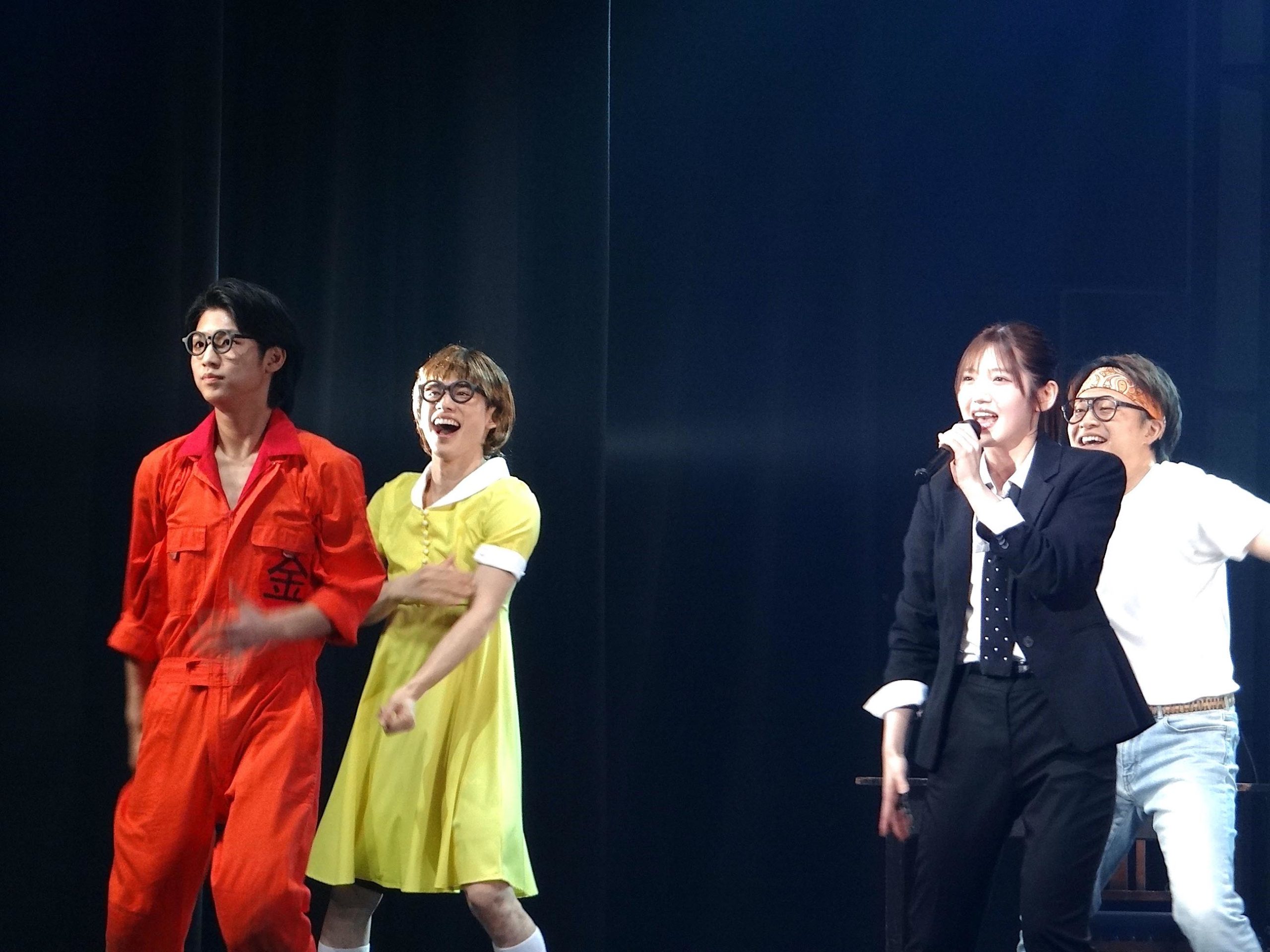 マイクを手に高らかに歌い踊る村山彩希とともに舞台に飛び出し華麗に踊るキャスト陣、前日に出演ラストだった(?)の久保田創も「走ったら間に合った!」と吉田とともに全身タイツ(!)で登場し、次々とこの日限りの演出が繰り広げられていく。